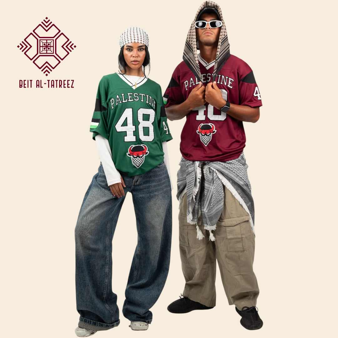 The Burgundy 48 Palestine Jersey is all about strength and pride. Its deep tone and striking print bring energy to any fit, while its relaxed cut delivers comfort and confidence. A jersey for those who refuse to blend in.