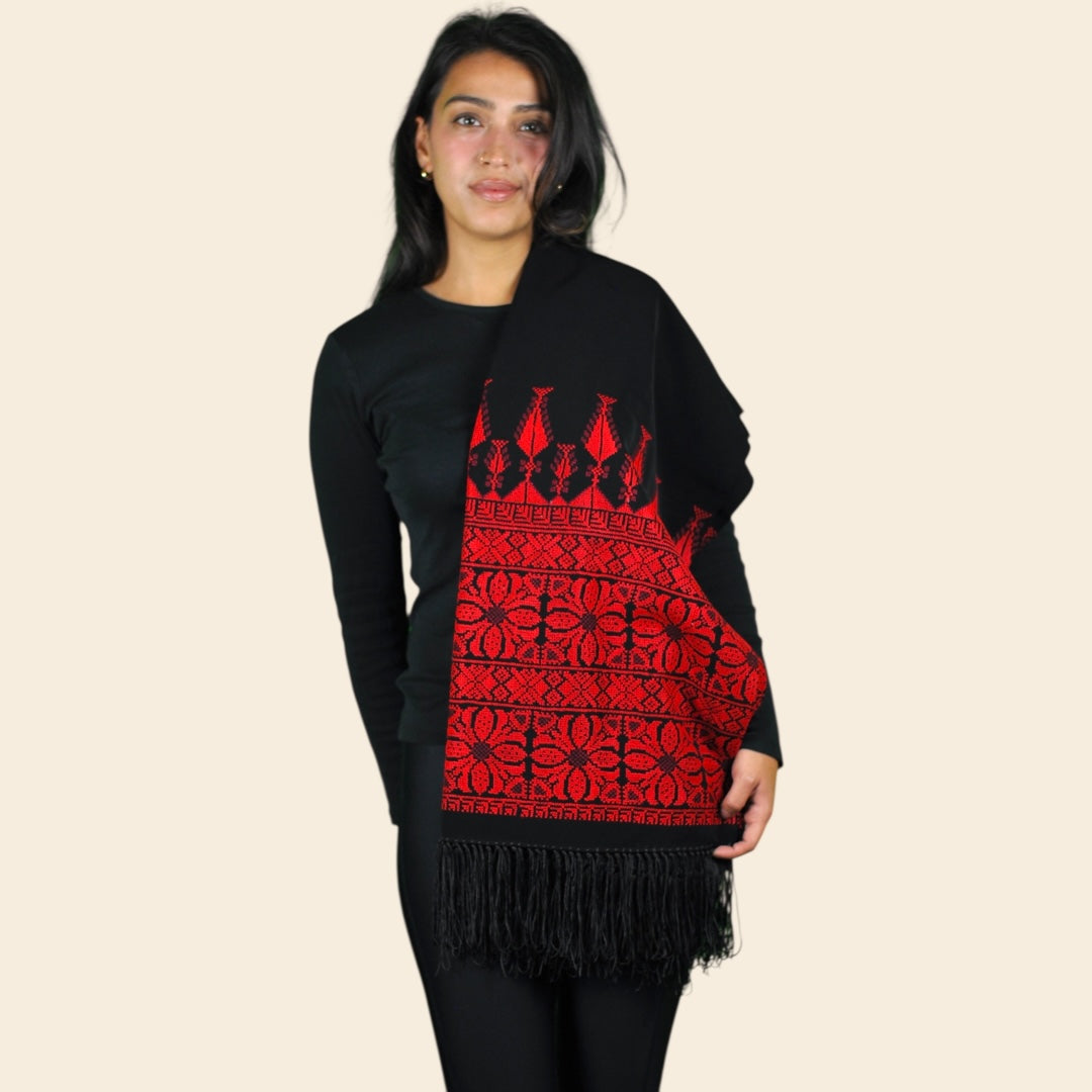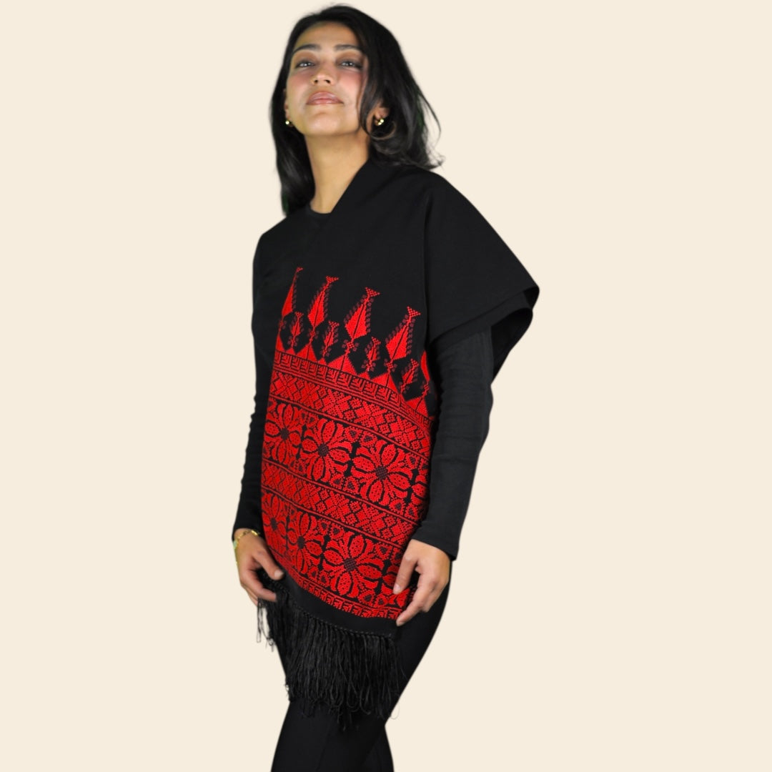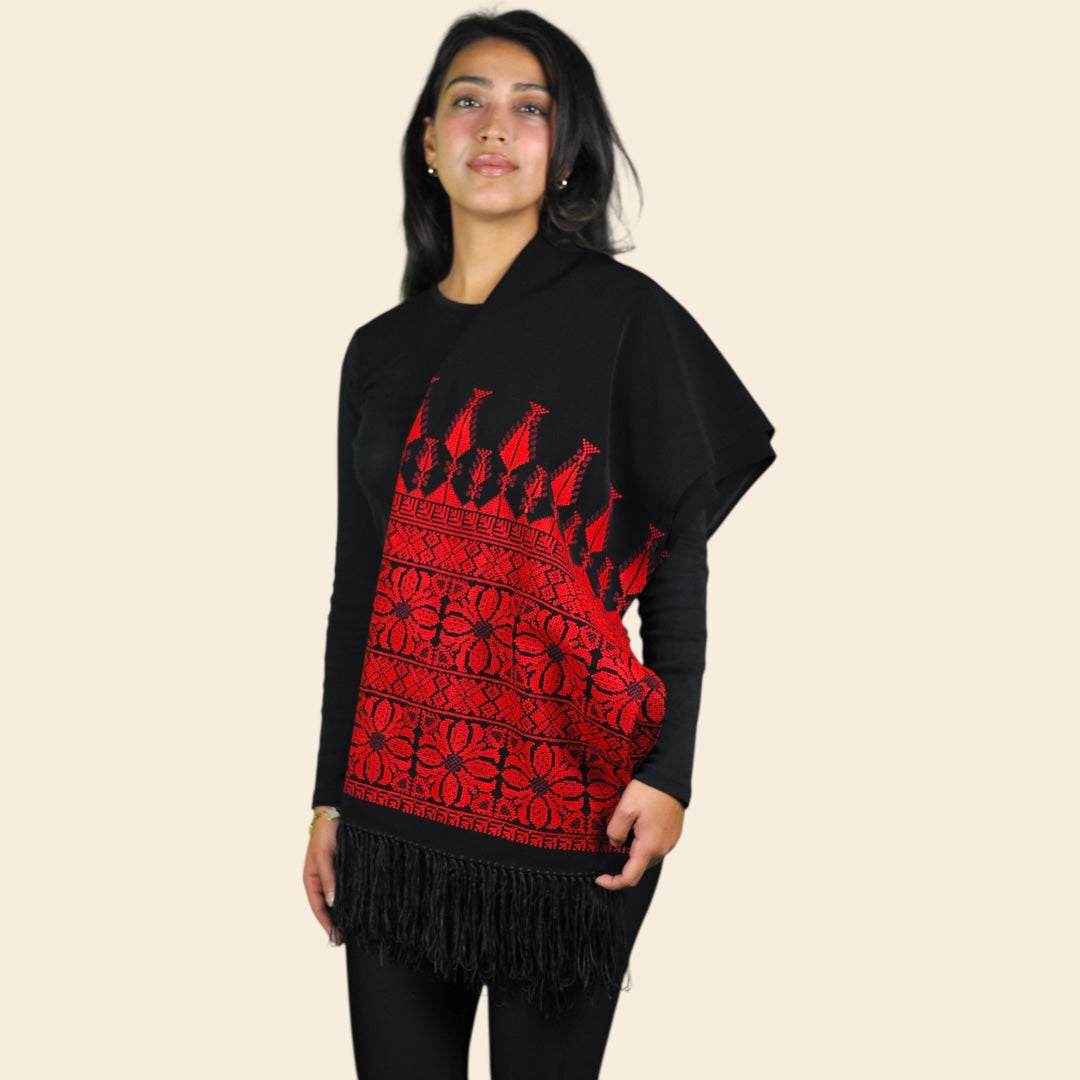 This handcrafted shawl is a true masterpiece of Palestinian heritage, adorned with rich, heavy tatreez that showcases the depth of traditional artistry. Every inch is carefully embroidered with intricate cross-stitch patterns, preserving stories passed down through generations. Made with care and precision, Rouh Al-Tatreez is more than a shawl—it's a statement of culture, resilience, and timeless beauty. Perfect for those who appreciate the elegance and authenticity of Palestinian women artisans.